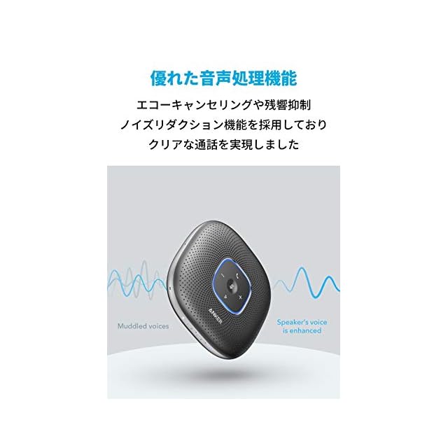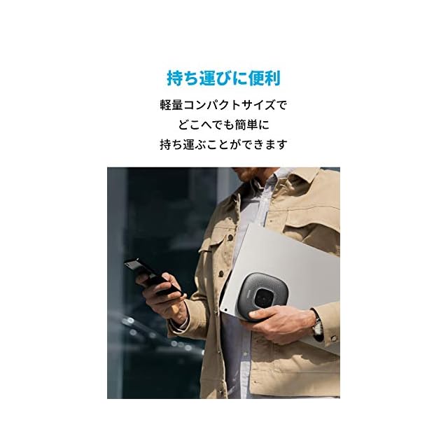 主な製品仕様:<br> 重量:約340g<br> オーディオ出力:1 x 3W<br> 接続方式:Bluetooth / USB-C <br> Bluetooth規格:5.0<br> バッテリー容量:6700mAh<br> 通話時間: 24 時間<br> 入力:USB-C × 1, 5V/2A <br> 出力:USB-A × 1, 5V/2.1A<br> <br> 全指向性マイク搭載:6つの内蔵マイクが、360°全方位をカバーし、最大8人の音声を集音します。<br> <br> カスタムDSPアルゴリズム:リアルタイムエコーキャンセリング、残響抑制、ノイズキャンセイリング機能などの優れた集音機能によりクリアな音声を通話先に届けます。<br> <br> ボリューム調整:PowerConfから離れた場所から話していても、優れた集音技術により、自動で音声の大きさが調整され、通話先にはクリアで十分な大きさの音声を届けることが出来ます。<br> <br> 簡単セットアップ:Bluetooth、もしくはUSB-Cケーブル経由で有線でも無線でも接続可能です。macOSとWindows 7、8、 10を搭載したコンピューターに対応しています。<br> <br> 大容量バッテリー:24時間連続使用可能な大容量バッテリーで、他の機器への充電も可能です。<br> <br>