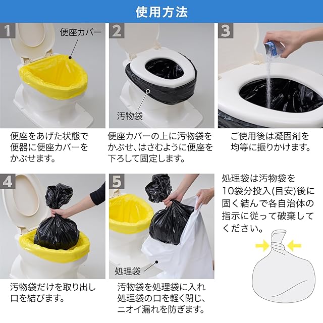 ●セット内容 : 凝固剤(アルミ包装)×100袋(10g)、汚物袋(黒)×100枚(約650×500mm)、便座カバー(黄色)×4枚(約650×500mm)、処理袋(白)×10枚(約650×800mm)●材質 : 凝固剤/高分子ポリマー、汚物袋/ポリエチレン、便座カバー/ポリエチレン、処理袋/ポリエチレン