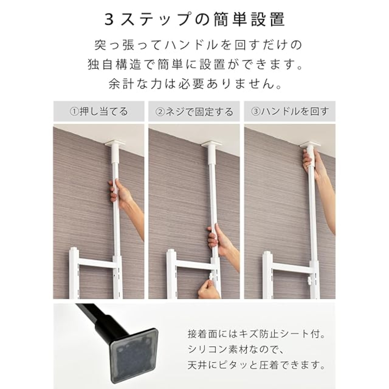 \魅せる、整える、使いやすい/<br> ekans「棚付きランドリーラック 突っ張りタイプ LSH-T200」<br> <br> 【無駄を省いたミニマルフレーム】<br> ●スリットレール採用で圧迫感を消したスッキリデザインに<br> ●フレームに直接差し込むので、外れにくく安定感もアップ<br> ●伸縮しても同じ色(一般的なラックは伸ばすと違う色のパイプが出てくる)<br> <br> 【高さが変えられる可動棚】<br> ●棚の高さは9段階で調節可能<br> ●物が落ちにくいワイヤー付き<br> ●水に強いPVC加工<br> <br> 【簡単設置】<br> ●ハンドルを回すだけの簡単設置<br> ●天井との接着面にはキズ防止の圧着シート付き<br> ●防水パンの枠に設置できるアタッチメント付き(幅約2cm)<br> <br> 【材質】<br> スチール(エポキシ樹脂粉体塗装)<br> ABS樹脂<br> ポリプロピレン樹脂<br> パーティクルボード(メラミン樹脂+PVCシート)<br> シリコン<br> <br> 【サイズ】<br> (約)幅60x奥行29.5x高さ210-270cm<br> <br> 【耐荷重】<br> 棚1段あたり:約6kg<br> <br> 【セット内容】<br> ランドリーラック本体×1<br> 棚板×2<br>