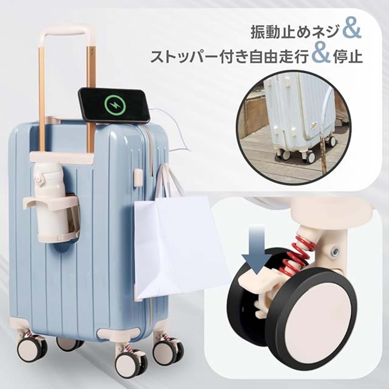 【多段階キャリバー&静音キャスター】キャリーケースは超軽量アルミ製キャリバーを採用、頑丈で揺れ動きにくく、キャリバーの高さを自由に調節できます。ボタン付きハードキャリーは身長に合わせて使えます。スマホスタンド機能付きます。キャリーバッグは360°独立に回転できるダブルキャスターを採用し、スムーズな動きと安定した走行が可能となります。走行音が静かで楽な双輪キャスターを採用しました。また、キャスターストッパー&振動止めネジ付き、電車や坂道で立ち止まっても、手を添えなくても停止でき、転がらないので安心です。