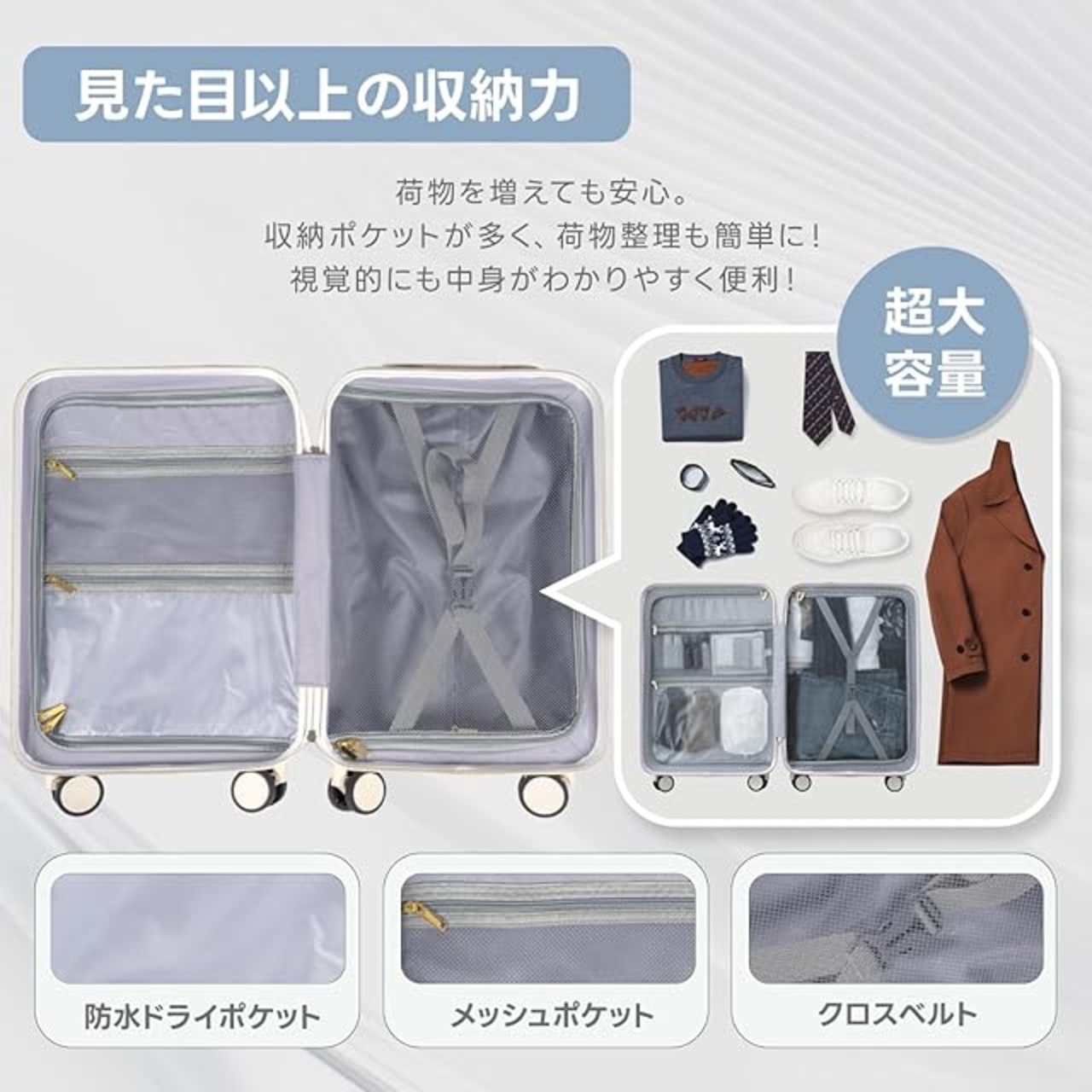 【大容量&多機能】内装に再生素材を使用しました。高品質裏地素材と両面のXバンド合わせて、荷物をスッキリ収納できます。便利な仕分けポケットで荷物を衛生的に整理でき、乾湿を分けて収納できます。インテリアは合理的な収納仕切りで、行きも帰りも楽になります。スーツケース 機内持ち込みでき、USB充電ポート付き、ドリンクホルダー&荷物フック付き、多機能なデザインと使いやすさが魅力です。