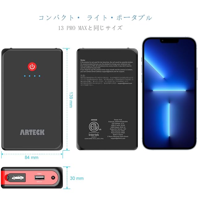 商品内容:Arteck 多機能カージャンプスターター 外部バッテリー、収納ケース、入力充電ケーブル、ジャンパーケーブル用クランプ、ユーザーマニュアル、そして弊社人気の2年保証と親身なカスタマーサービス,メーカー2年間保証。