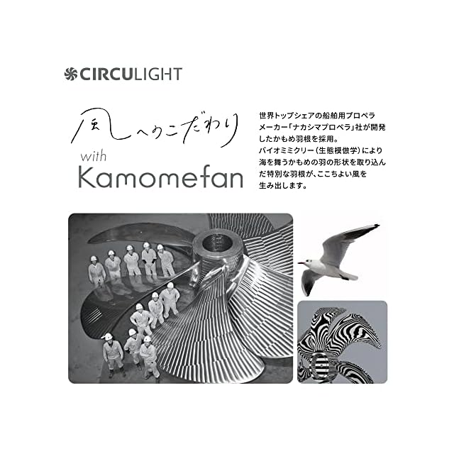 スイング機能搭載、Kamomefanを採用した「簡単取り付け」のシーリングシリーズ。ライトをつけると爽やかな風が吹いた。引掛シーリングに簡単取付ネジ留め不要。