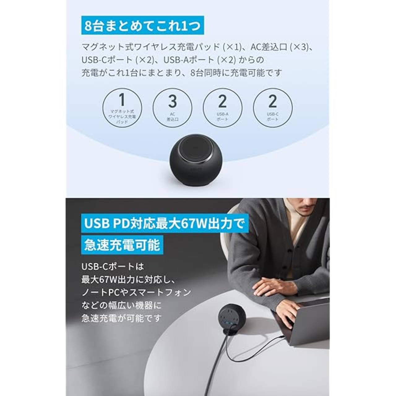8台まとめてこれ1つ:マグネット式ワイヤレス充電パッド (×1) 、AC差込口 (×3) 、USB-Cポート (×2) 、USB-Aポート (×2) からの充電が可能。これ1台にまとまり、8台同時に充電可能です 。