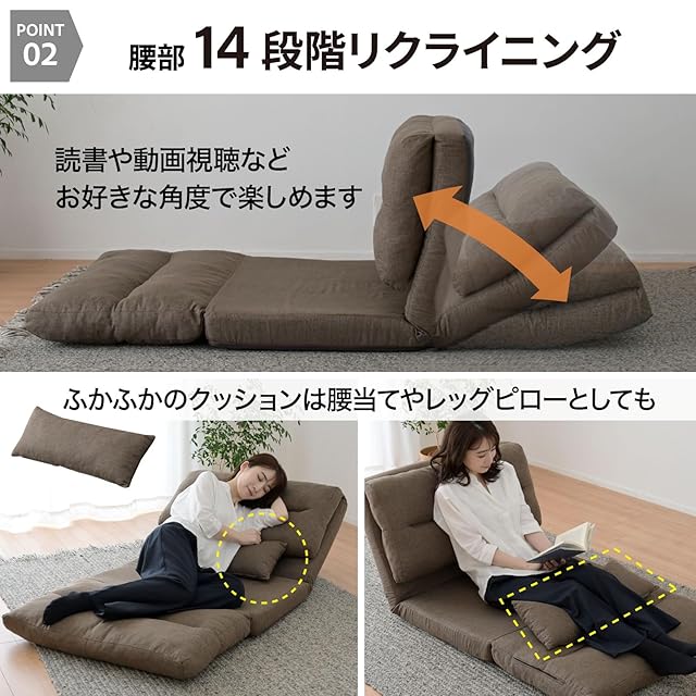 【腰部14段階リクライニング】腰部が14段階でリクライニングするので、座椅子のようにもお使いいただけます。しっかりと厚みのある座面で底付き感を感じません。