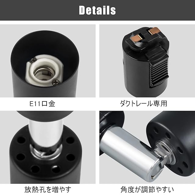 ライティングバー用スポットライト LED電球付き 器具セット 【電球仕様】 色:ブラック 消費電力:6W 入力電圧:AC100V 50/60HZ 口金:E11 色温度:電球色3000K 全光束:450lm サイズ:Φ50*H62mm 照射角度:40° 重量:35g 【器具仕様】 口金:E11 色:ブラック サイズ:約W41mm×H122mm×D41mm 重量:116g