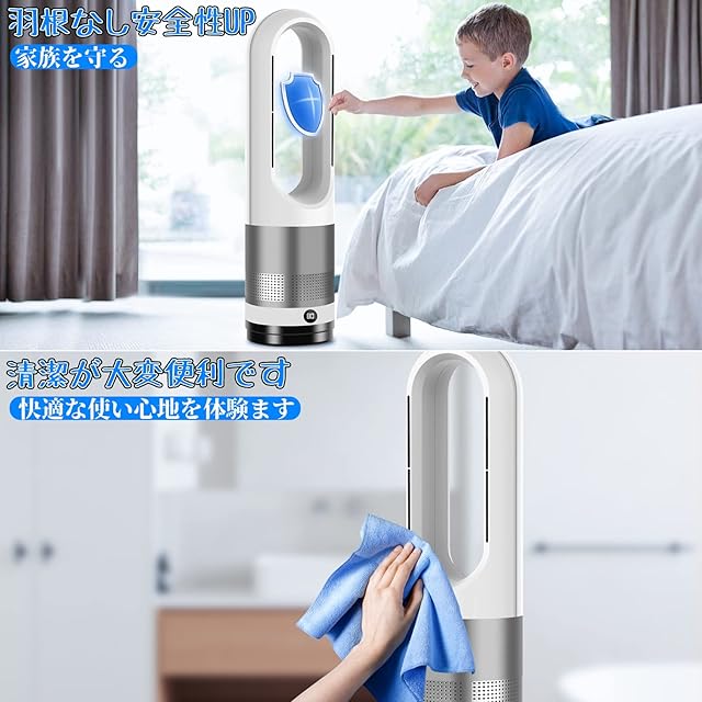 【羽なし安全設計&家族に安心を提供】弊社の羽根なし扇風機は、羽根を回転させることなく冷暖風を提供する安全な設計になっています。送風口は狭く、赤ちゃんやペットが触れても怪我をする心配がありません。これにより、子供やペットの好奇心を守り、安全上の問題を減らすことができます。また、メンテナンスが簡単です。分解して掃除する必要がなく、時間と労力を節約できます。羽根なしの構造により、羽根を拭くといった面倒な作業が不要で、メンテナンスがスムーズに行えます。この羽根なし扇風機は、家族の安全と快適さを重視した設計で、家庭に最適なリビング扇風機です。