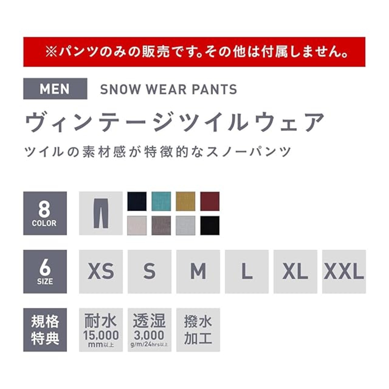 【ヴィンテージツイルパンツ】ツイルの素材感が特徴的なスノーパンツ<br>【選ばれる理由を徹底したこだわり】≪ライダーの声と共に創る物づくり≫…毎日ウェアを着て過ごすプロライダーだから気づけるポイントを機能に反映。丁寧なもの作りの姿勢で高品質な一枚を。≪高品質を支えるパートナーシップ≫…現地工場の長期的提携によりコストと供給の安定。日本式の技術指導の徹底によるスキル向上で高品質を実現。最高の一着をお客様のもとへ。≪素材へのこだわり≫…耐水性・透湿性・撥水性に優れた透湿防水素材!<br>【使いやすさを追求した機能性】ウエストベルト、サイドポケット、パウダーガード、ヒップシーム、ヒップポケット、ブーツゲーター、サイドスリット、アジャスターベルト、ブランドロゴピス、ジップ引き手<br>【3D立体裁断】ライディング時の動作で最も負担のかかる股下を3Dパターンによるマチを作ることで、可動域を大幅に拡大。膝部分にも屈伸時の負荷を最大限に減らす立体縫製。穿き心地も上達には欠かせないポイントのひとつ。【ヴィンテージツイル】特殊な染色加工によりムラ感のある素材感を演出。強度はそのままに従来の素材よりも20%ほど軽量化にも成功(当社比)。アースカラーからポップなカラーまで幅広くリリース。<br>【注意】パンツ単品の販売になります。ジャケット/ゴーグル/グローブ等は付属致しませんので、予めご了承ください。