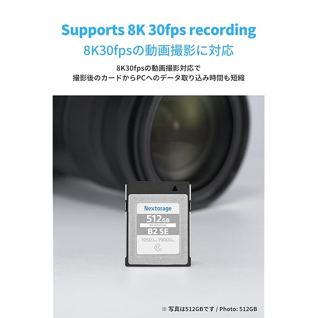 Nextorage CFexpress Type B NX-B2SE512Gはミッドクラス価格帯のCF-express typeB カードでありながら最大書き込み速度1900MB/sを実現。さらに、最低継続書き込み速度800MB/sを達成し、8K30fpまでの動画撮影をサポートしています。 撮影後の編集なども最大読み込み速度1950MB/sの高速性能で作業時間を短縮し、作業効率の向上に寄与します。 日本メーカーであるネクストレージならではの高い品質と信頼性を提供し、プロフェッショナルな映像クリエイターやフォトグラファーに最適なメモリカードです。NextorageのCFexpress Type BはXQD対応カメラ*のファームウェアがCFexpressに対応している場合、下位互換により既存の機器を使用しながらも、次世代の性能を体験することが可能で、機材の更新にかかるコストを抑えることが可能です。 *XQD対応カメラでCFexpress Type Bカードを使用できるのは、カメラ側のファームウェアがCFexpressに対応している場合です。ただし、動作保証はカメラによって異なるため、使用前にそれぞれの機種のファームウェアを確認する必要があります。 いままでご利用いただいていたSDカードからの乗り換えとしても最適です。また、5年間のメーカー保証に加え、ダウンロード特典としてメモリーカードファイルレスキューが付属。大切なデータを守るサポートも充実しています。 CFexpress Type B 512GBメモリーカードを使用することで、ストレスのない高速なデータ転送と安心感を得ることができ、次世代の撮影や保存ニーズに対応します。同じシリーズでは512GBだけでなく、128GB、256GBもご用意しており、お好みの容量を選択して購入可能です。