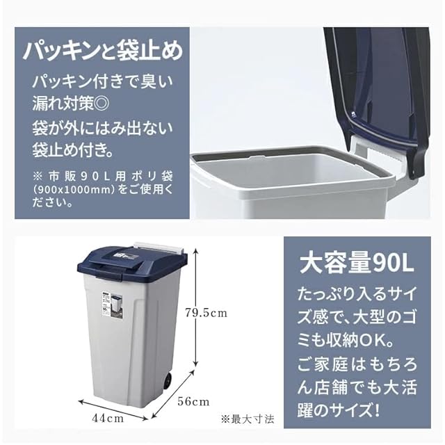 本体・フタ・止め具・ポリ袋止め・転倒防止スタンド・取付リング=PP、フタパッキン=発泡PE、車軸・ワッシャー・ネジ=スチール、後輪=TPR/PP、ナット=ナイロン/スチール、排水栓=PE、排水栓パッキン=シリコーンゴム