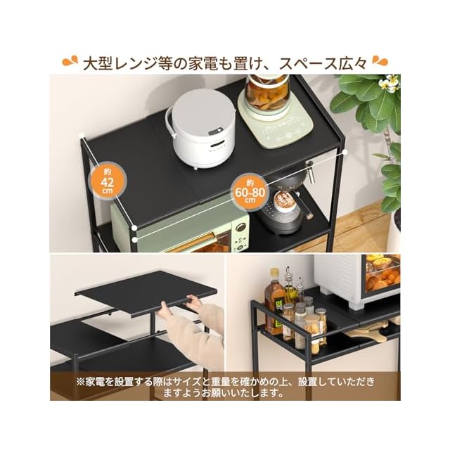 【家電も置ける広めの奥行42cm】トースターや電子レンジ等の家電、フライパンや収納用バスケットなど大きな物も収納できます。1段あたり大小2枚の棚板で構成されており、取り外しも簡単♪高さのあるものを収納する場合はに棚版を1枚取り外すなど、収納物に合わせた自由自在なアレンジも可能となっております。