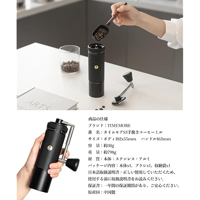 1.ブランド:TIMEMORE 型番:栗子S3コーヒーミル 材 質 :ステンレス・アルミ(全金属) 刃:S2C-042-EIステンレス臼 サイズ:ボディ182x55mm ハンドル163mm 容 量 :約30g 重 量 :約798g