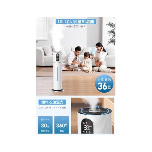 加湿器 大容量 10L 【2024冬新登場 多重除菌 & 自動湿度調整】 上から給水 超音波式 3段階ミスト調整 マイナスイオン UVライト除菌 超音波加湿器 空気清浄機 湿度設定 長時間連続加湿 タイマー付き アロマ対応 吹出口360°調整 タッチパネル リモコン付き 静音 空焚き防止 水漏れ防止 省エネ 36畳 部屋 寝室 リビング オフィス 乾燥対策 花粉対策 (ホワイト)