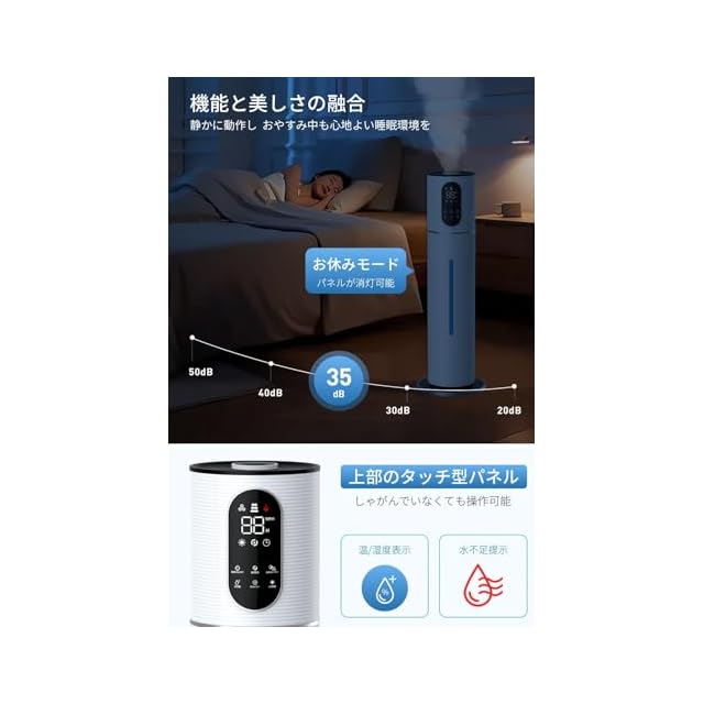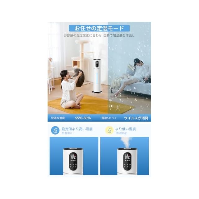 【湿度設定 タッチパネル&リモコン両用】部屋の乾燥具合に応じて細かく湿度を設定し、設定値に達したら噴霧自動停止できる加湿器なので、加湿しすぎによる結露、カビなどを防ぎながら、常に程よいうるおいをキープしてくれて、冬場も心地よく過ごせます。また、タッチセンサー式の操作パネルを採用し、軽く触れるだけで電源オン/オフやモードの設定などの操作が可能、もちろん、付属のリモコンでもすべての機能を簡単に使用できるので、ソファやベッドの上でゆっくりくつろいだままでも遠隔操作できてさらに便利!
