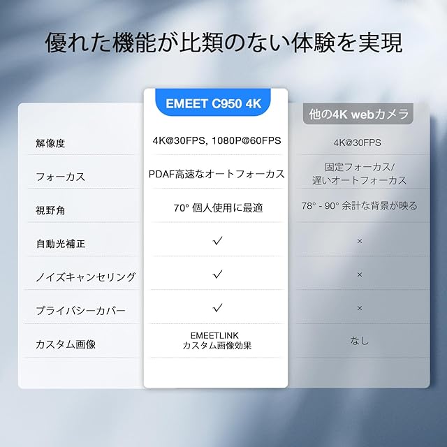 【800万画素WEBカメラ、圧倒的なパフォーマンス】 EMEET C950 4Kウェブカメラは、800万画素の高解像度を誇り、最大UHD 4K(30FPS)の映像を提供します。さらに、1080p解像度と60fpsのフレームレートもサポートしています。ビジネス会議、オンライン教育、ライブストリーミング、ゲーム実況など、さまざまなシーンで細部まで鮮明に映し出す高画質な映像を実現します。 【PDAFオートフォーカス機能、ノイズキャンセリングマイク付き】 EMEET C950 4K webカメラは、高速かつ正確なPDAFオートフォーカス技術を搭載しています。被写体の動きやシーンの変化に迅速に対応し、プロフェッショナルな映像体験を提供します。内蔵のノイズキャンセリングマイクは、周囲の雑音を効果的に除去し、クリアで高品質な音声をキャプチャします。 【70°の視野角、フレキシブルなデザイン】EMEET C950 4Kウェブカメラは70°の視野角で、不要な背景を最小限に抑え、高精細でクリアなビデオ画像を提供します。さらに、水平方向に15°、垂直方向に90°の調整(上下左右に3°の微調整)が可能で、ビデオ会議からプロフェッショナルな撮影まで、幅広い撮影環境に対応する高性能なカメラです。 。 【プライバシー保護、EMEETLINKでカスタム】 EMEET C950 4Kウェブカメラはスライド式の外置プライバシーカバーを搭載しています。このカバーにより、使用しない時にレンズを簡単に覆い、プライバシーを確保しつつ、レンズをほこりや汚れから守ります。また、EMEET製品専用のEMEETLINKソフトウェアを無料でダウンロードして、輝度、コントラスト、シャープネス、周波数などの調整や、ファームウェアのアップデート設定など細かな設定も可能です。 【プラグ&プレイ、幅広い互換性】 この小型4K webカメラはドライバーや複雑な設定が一切不要で、USBケーブルを接続するだけですぐに使用できます。Zoom、Skype、Microsoft Teams、Google Meet、Line、YouTube Live、Twitch、ニコニコ生放送、ABEMA、Google Hangoutなどと互換性があり、安定した高品質な通話を提供します。Windows(Win7、10、11)およびmacOS(10.10以降)に対応し、USBビデオデバイスクラス(UVC)モードでシームレスに動作します。