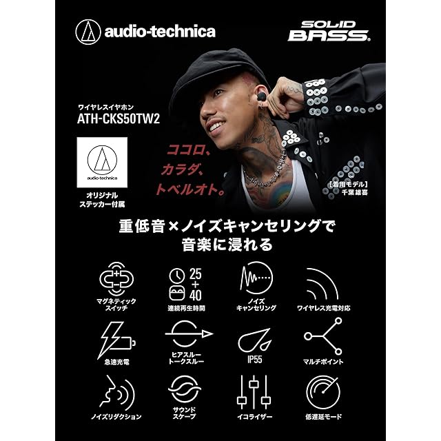 オーディオテクニカ ATH-CKS50TW2 BK(E) ワイヤレスイヤホン Bluetooth 5.3 ノイズキャンセリング 重低音 LE Audio対応 オリジナルステッカー付き マグネティックスイッチ機能 最大約65時間再生 IP55 防水防塵 マルチポイント対応 置き忘れアラート ヒアスルー 低遅延モード 急速充電 Qiワイヤレス充電対応 ブラック | primer