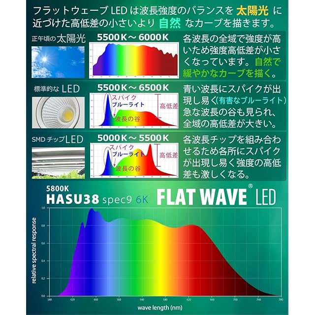 新しい植物育成ライトHASU38spec9は全レンジで強度の高い新設計のLEDチップに合わせてボディ形状をより熱吸収性の高いスワールボディへ改良しました。より太陽光に近い波長を持つLEDチップ(Bridgelux社製BXCD)は植物の光合成率を極限まで高めて室内での栽培に貢献します。ルーメン(光束)はルクス(照度)と異なり積分球で計測する必要があるためお客様で確認が難しい製品仕様値です。メーカー含め誤表記が多いため他製品との比較が難しいと考えております。個別回答にて対応しております。LEDトランスドライバーやLED素子のみの交換も可能なため保証期間(3年)が過ぎた場合の個別有料修理にも対応しています。広角リフレクター(反射板)付き。