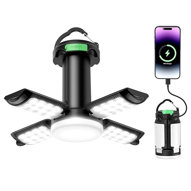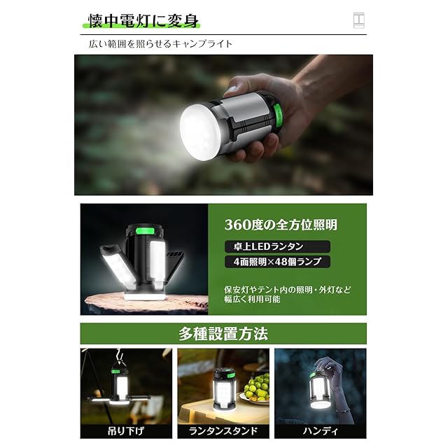 ☀【5面照明 USB充電式キャンプランタン】底部ライトと4つの側面ライトで総計60個高輝度ledチップを採用し、明るさは最大1000ルーメンに達し、5面照明により、前方や周り360°全方位を明るく照らしてくれます。フック付きのLEDランタンなので、テーブル置いたり、手持ちしたり、テント内や木の枝などに吊り下げたり、場面に応じた多様な設置方法が可能、停電時に部屋全体を明るく照らし、キャンプの時にもメインランタンとして使えます。USB充電式の3200mAh大容量で、満電状態では最大20時間の連続使用が可能です。