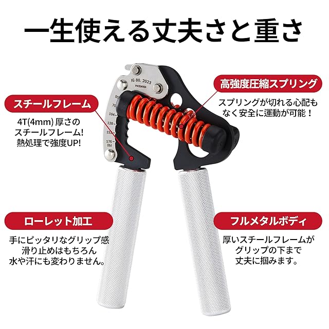 フルメタルの筐体がお届けする究極の堅牢性! GD IRON GRIPは、4mm厚の鉄板、精巧なローレット加工のアルミニウムグリップ、強力金型スプリングの使用によりその頑丈さは戦車並みです。他社製アジャスタブルハンドグリップと異なり、GD IRON GRIPは強力圧縮スプリングを用いるためスプリング破断のおそれがなく、安全です。安全性については心配ご無用、トレーニングにのみ集中していただけます。