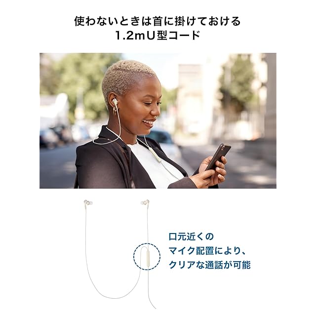 使わないときは首に掛けておける1.2m U型コード:右側のコードが長いため、首にかけて使用できるU型コードを採用。口元にインラインコントローラーのマイク が配置されているため、クリアな通話が可能です。また、コードが邪魔になりにくく、タッチノイズも抑えることができます。