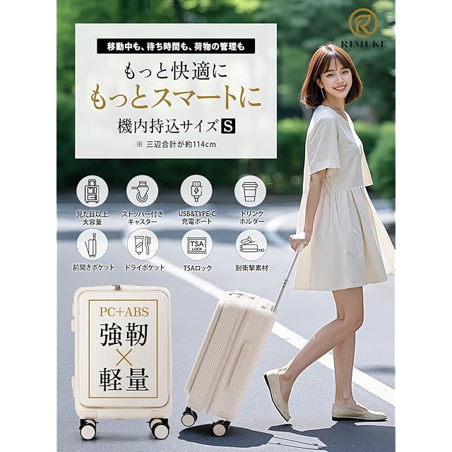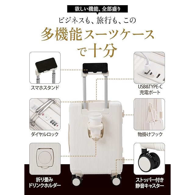 [RIMUKE] 前開き スーツケース 機内持ち込み キャリーケース パソコン収納ポケット USBポート付き カップホルダー付き キャリーケース 超軽量 360度回転 耐衝撃 ック 静音 旅行 ビジネス 出張 1泊2泊3泊 ホワイト | primer