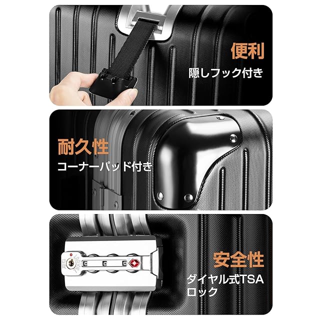 【改良されたアルミフレーム&ボディー素材】スーツケースは強化アルミフレームを採用し、従来のファスナータイプに比べ、高級感があって頑丈です。また、スーツケース本体の形状維持を強化させ、耐衝撃性と耐久性を向上させます。ボディーはABS樹脂とPCの混合素材で作られ、耐衝撃性に優れています。エンボス加工を施し、傷つきにくいです。