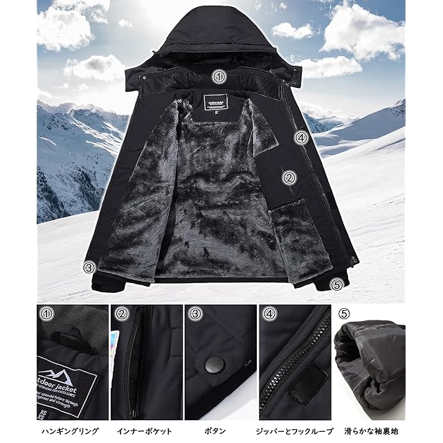 【多機能】1、撥水加工/防汚性/防風性:①防風、防水、防污のある機能性生地を採用します。②ファスナーは防水層デザインを付いて、防水性能を高めます。③ジャケットの継手の所に防水工芸を採用します。 2.防寒性/保温性:裏は裏起毛のデザインです。帽子と袖口の設計も保温性を強めます。 3.通気性/透湿性。