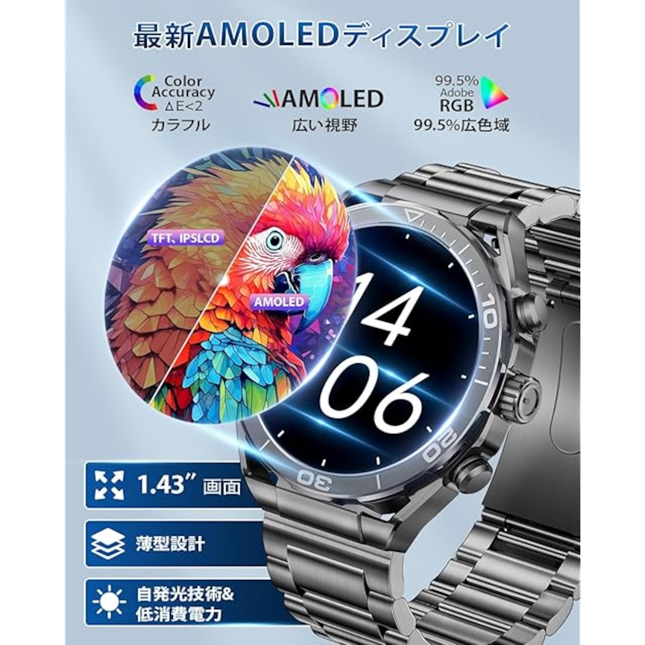 【最新AMOLED & CNC頑丈なボディ】 最新の1.43インチのAMOLEDディスプレイと耐久性に優れたHDゴリラガラスを採用。鮮やかな色彩と深い黒色を再現し、視認性が抜群です。広い色域と高いリフレッシュレートを実現し、最大輝度1000nitsで、屋外でも情報、運動、睡眠データなどが明瞭に表示されます。頑丈で耐久性のあるCNC加工ボディに、傷つきにくく、長期間美しい状態を保てます。日常生活からスポーツまで、あらゆるシーンで活躍します。美しさと実用性を兼ね備えた最高級の仕様をご体験ください。