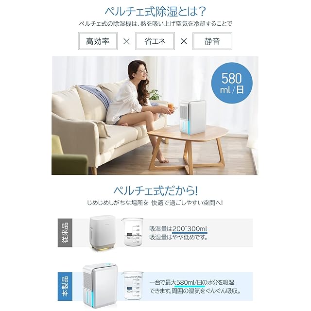 【最大20畳対応 強力除加湿】580ML/日のハイパワーでスピード除湿、ジメジメした空気を吸い込み、結露させることで余分の湿気を取り除くペルチェ式除湿機です。湿気によるカビ・結露・異臭などいろんな悩みを一気に解決。除加湿一体型の1L大容量タンクは取り外し可能で、水がなくなる時、満水の時は自動的運転停止、水捨ても便利。付属の排水ホースを繋ぐと水捨ての必要がなく、より長時間に連続排水することも可能。さらに、乾燥が気になる季節なら、タンクに水を入れて、加湿器として利用することもできます。