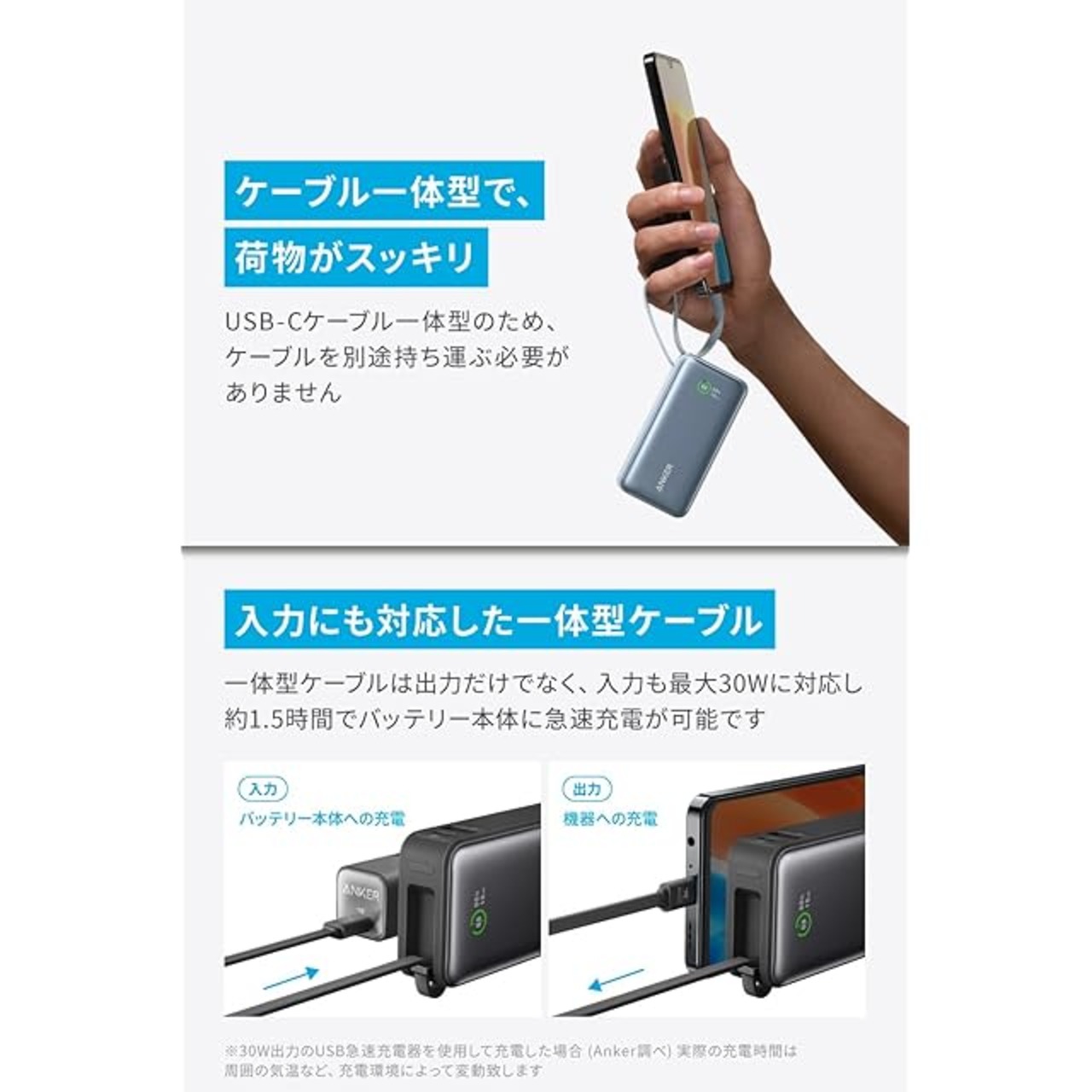 バッテリー本体にも急速充電:一体型ケーブルは出力だけでなく、入力も最大30Wに対応し、約1.5時間でバッテリー本体に急速充電が可能です。 ※30W出力のUSB急速充電器を使用して充電した場合(Anker調べ)