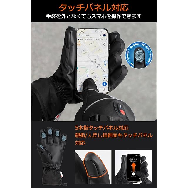 【2X8000mAh大容量バッテリー付き電熱グローブ & タッチパネル対応】この電熱グローブには、8000mAhの大容量バッテリーが2個付属しており、長時間使用でも安心です。最先端のリチウムイオン電池を採用しているため、小さなサイズでこの容量を実現しています。卵1個分という軽さで持ち運びも便利です。5本の指だけでなく、親指と人差し指の側面もタッチパネルに対応しています。手袋を着用したままでもスマートフォンを自由に操作することができます。