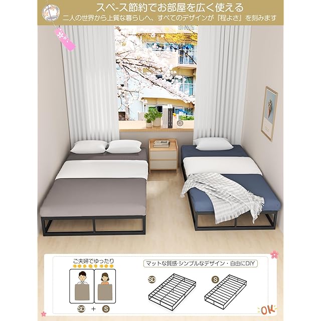 【きしみなし・耐久性に優れるパイプベッド】こちらのベッドフレームは全部金属のすのこを支えるタイプで使用感はきしみやがたつきがなく、木製のベッドフレームより倍程頑丈です。