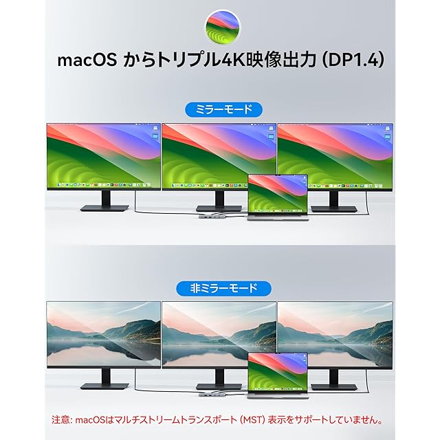 【最大3台のデスプレイに4K高精細映像出力】HDMIポート×2とDisplayPort×1で最大3画面出力可能なUSB Type-Cドッキングステーション 3画面出力。モニターを使って大画面で作業をしたり、USBメモリでデータをやり取りしたりすると、ポートが不足しがちになります。このマルチモニター 3画面ドッキングステーションを使うことで、モニターを増やしたり、周辺機器をよりパワフルに使えたりするようになります。★★★【ご注意】:①、4K/60Hzを利用するには、PCがDPort 1.4 Alt Modeに対応必要。②、PCはIntel第10世代以前のプロセッサーの場合は、2つのディスプレイを拡張しかできません。③、MAC接続時のご注意:この製品はMACの外部モニター2台以上の拡張モードをサポートしていません