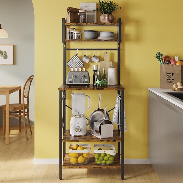 【全5段の棚板で充実の収納力】限られたスペースに5段キッチン収納ラック!2つの上棚で調味料を手軽に取り出せて便利です。耐荷重約23kgの大天板で大型レンジまでも安全に置けます。高さ調整可能な2つの下段棚板も採用、キッチン家電、食器、キッチン用品をまとめて収納できます。10個のS字フックも付属しており、キッチンの小物を整理整頓。デッドスペースを無駄なく幅広い用途に対応、使いやすいキッチンを