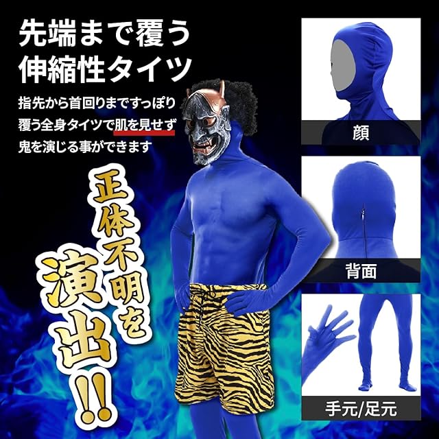 ✅【セット内容】全身タイツ×1点・虎柄パンツ×1点・お面×1点・ウィッグ×1点・棍棒×1点 【サイズ(約)】全身タイツ:フリーサイズ 虎柄パンツ:ウエスト61cm~116cm(ゴム紐でサイズ調節可能)/丈40cm お面:26cm×16cm ウィッグ:頭囲48cm 棍棒:70cm×15cm 【カラー】レッド・ブルー※お好みのカラーをお選びいただけます。