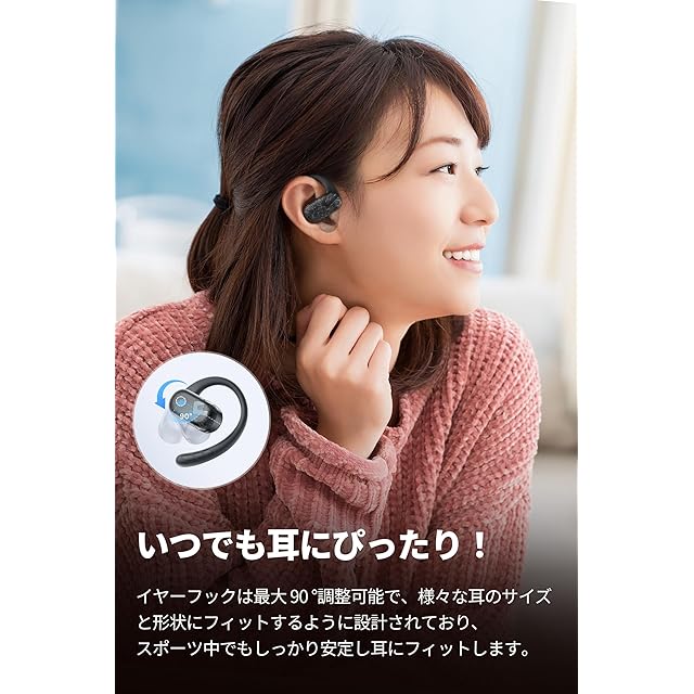 【進化!角度調整可能なイヤーフック】イヤーフックは、よく見かける固定式ではありません。無段階に角度調整できるため、すべての方に最適な装着感と「聞こえ」を提供します。カナル型イヤホンは耳穴の個人差があるためジャストフィットさせることが難しく、クリップ型イヤホンは圧迫感・異物感があるため長時間の連続使用は難しいものですが、イヤーフックを無段階に角度を調整できるBreezyは長時間装着しても安心、快適です。