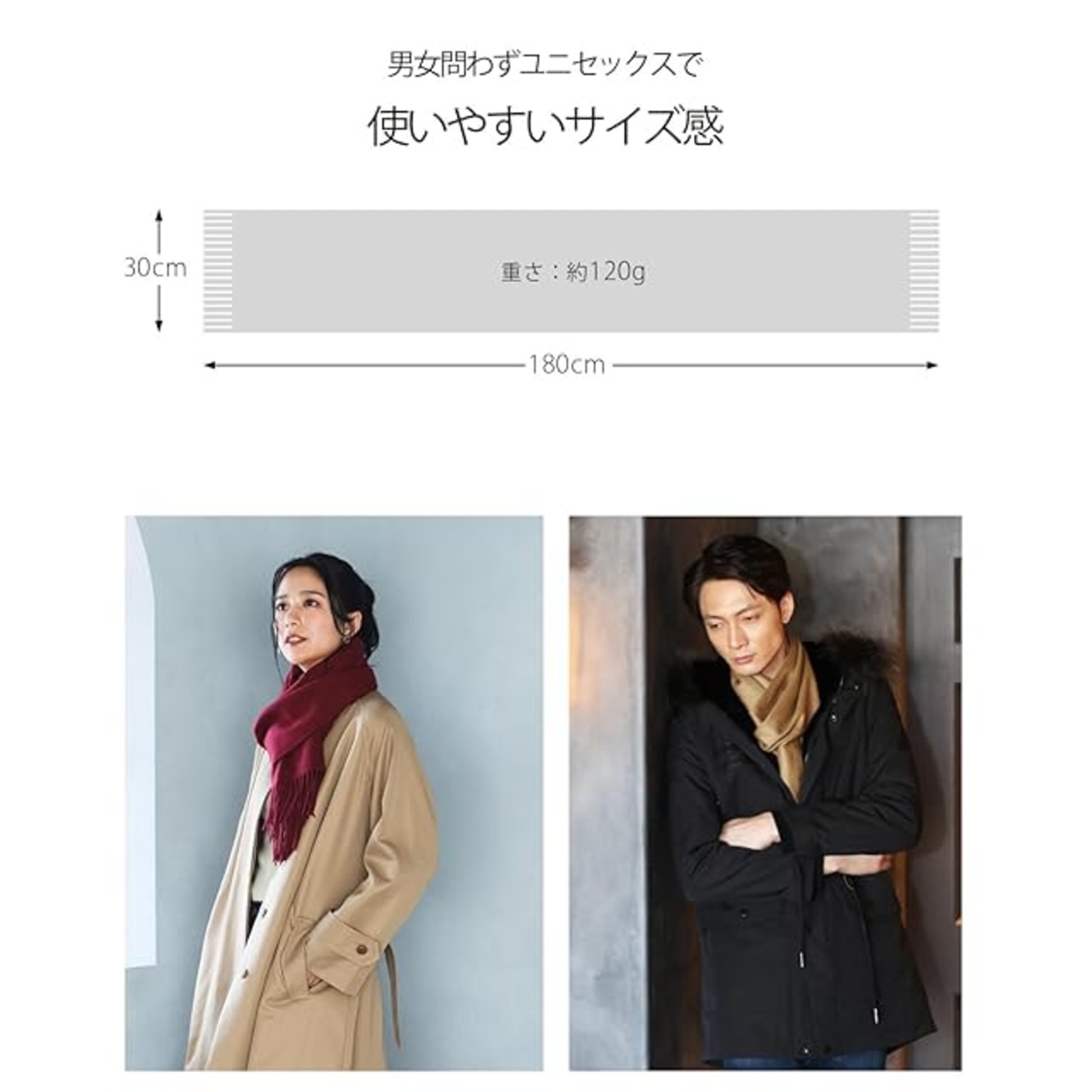 ✅【使いやすいサイズ感】コートやスーツの邪魔にならない、全長180cm×幅30cmのマフラーです。畳むとコンパクトなサイズになるので、使わない時はバッグに収納して持ち運びも楽に行えます。