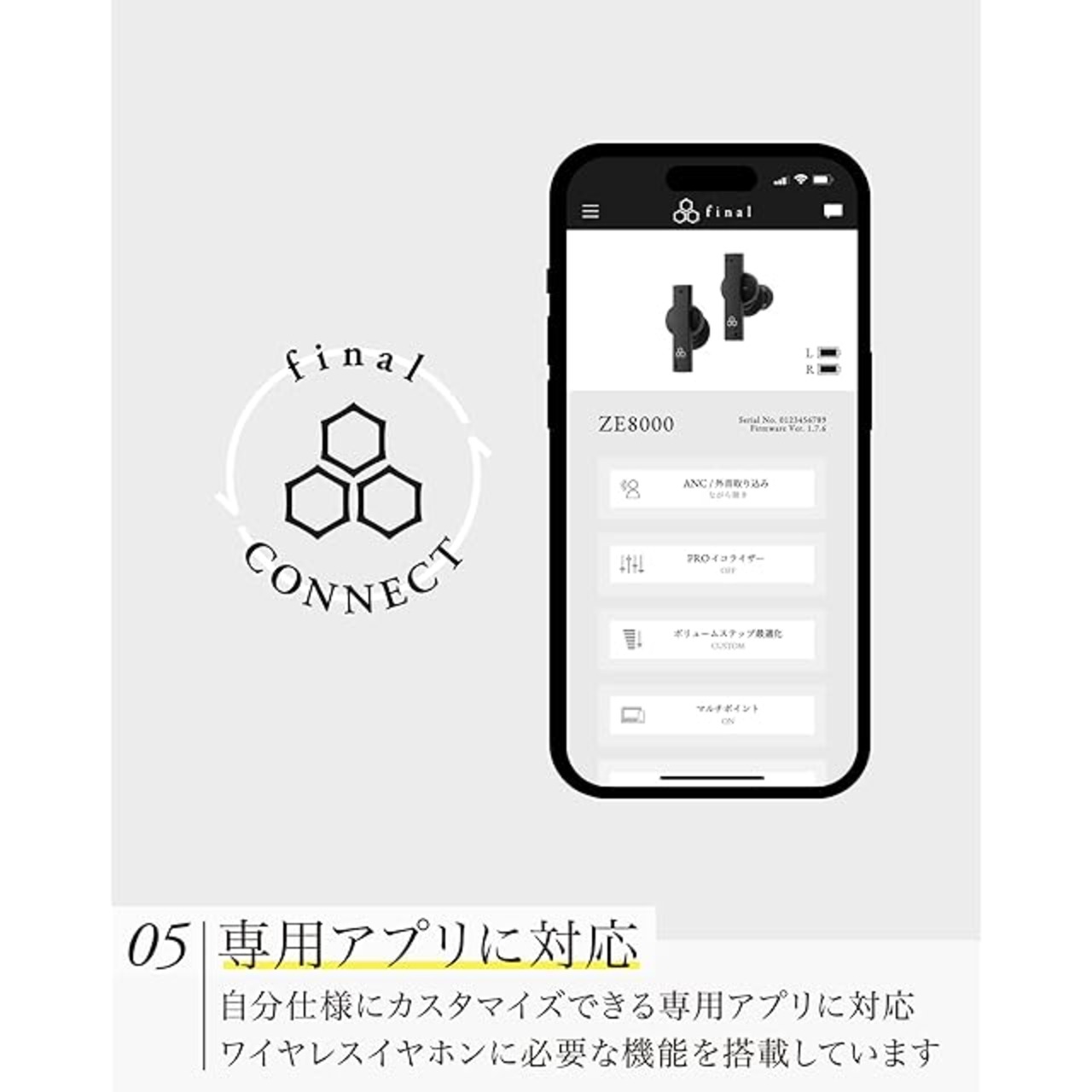【専用アプリfinal CONNECT】ノイズキャンセリング/外音取り込みの4つのモード切り替え・簡単にプロのエンジニアような音質調整が可能な「Pro イコライザー」の設定・自分の最適な音量にピッタリ調整ができるようになる「ボリュームステップ最適化」の設定・音声ガイダンスの言語切り替え(日本語/ 英語)・「8K SOUND+モード」への切り替え
