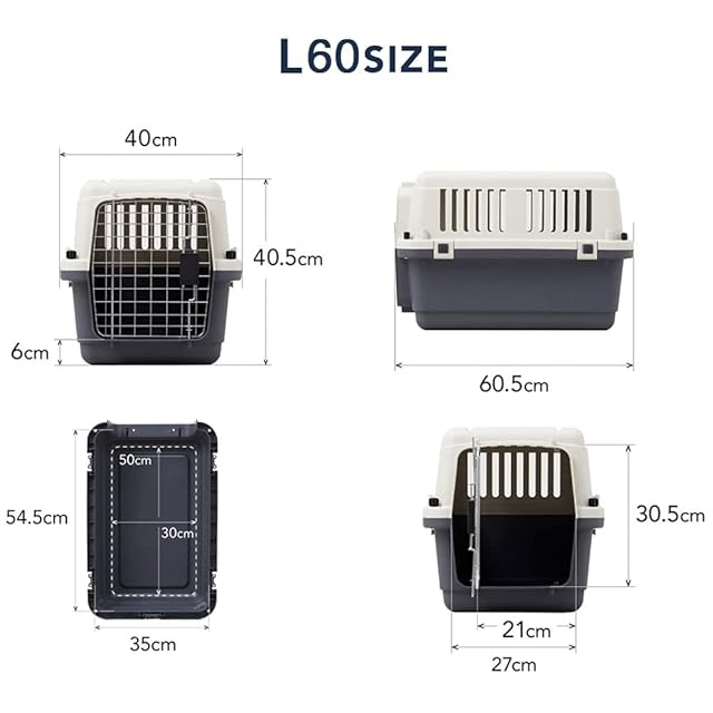 ✅L60サイズ(約):【外寸】幅40×奥60.5×高40.5cm【内寸】幅35×奥54.5×高38cm【底面】幅30×奥50cm【入口】幅21×高30.5cm ●重量(約):3kg ●耐荷重(約):~11.5kg ●材質:【ケージ】ポリプロピレン【ドア】スチール ●生産国:中国(企画・デザイン:中国) ●メーカー:株式会社オーエフティー