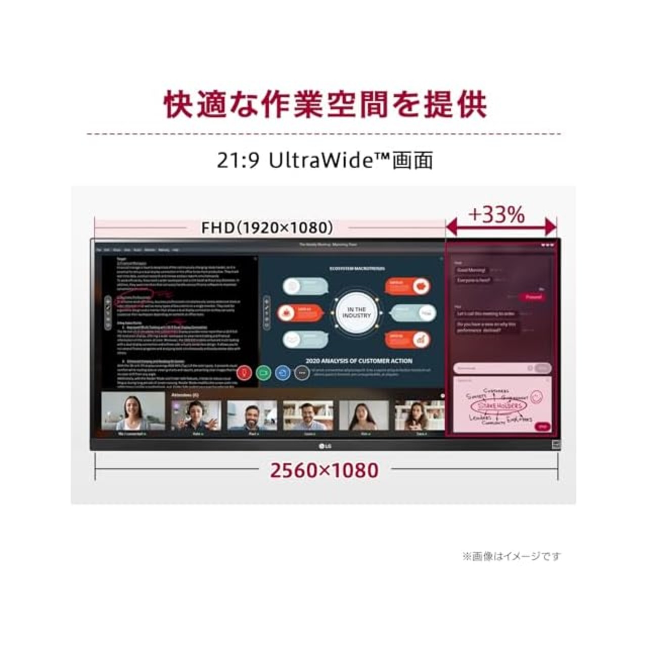 【効率的な作業性】 ビジネス ウェブで調べたり、ツールで分析した結果を元に資料作りするときに、その都度ウィンドウを切り替えていませんか?ウィンドウの切替えが頻繁になれば効率が低下し、思考の停止にもつながります。横長の画面によって、複数のウィンドウを並列させる十分な表示領域を提供。思考を止めず、効率性の高い作業が可能になります。