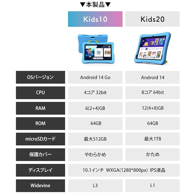 (Android 14 go、RAM 6GB(2+4GB拡張)+ROM 64GB) 2025最新のAndroid14 タブレット 10インチ Wi-Fiモデル は、1.8GHzの4コアCPUも搭載によりもっとスムーズな操作感が実現。2GBのRAMに加え4GB仮想RAMをサポート、6GB大容量RAMを用いて、よりスムーズに操作できます。本体の64GBのROMに加え最大512GBのmicroSDカードをサポート。ストレージで、写真、ビデオ、ドキュメントをさらに保存できます、より多くのメモリの可能性があります。Android 12/13 と比較して、Android 14 go の UI は大幅に変更されました。システムの基盤となるコードを最適化し、さらにパーソナルかつ安全に、簡単に操作できるOS。安定したスムーズなOSサービスを体験するだけでなく、LINE/YouTube Kids/Yahoo/Twitterなどのお気に入りのサードパーティアプリケーションをインストールすることもできます。Kids 10 タブレットは、ハロウィーン、クリスマス、新年のお子様への喜ばれるの贈り物です。