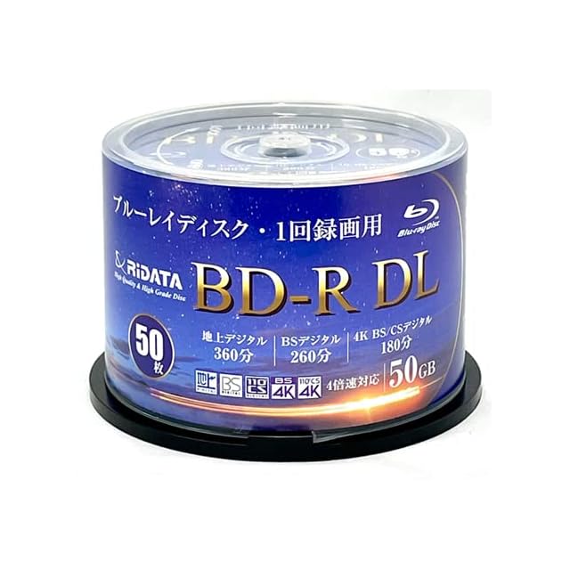 【商品詳細】・1回録画用BD-R DL 50GB 50枚 スピンドルケース入り・地上デジタル/BSデジタル/4K BS CSデジタル対応・インクジェットプリンター対応ホワイトレーベル(内径22mmまで印刷可能なワイドプリンタブル)・キズ、ほこりに強いハードコートディスク・信頼のRiTEK製
