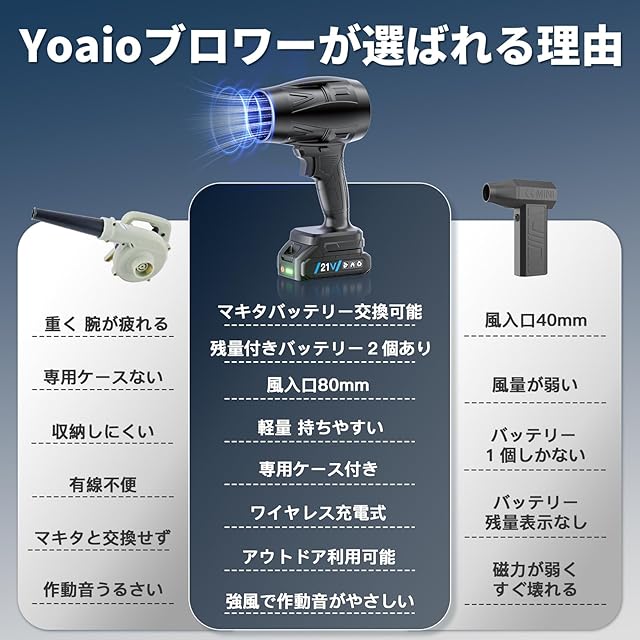 Easylife JP(全品保証あり)店舗だけ純正品を販売しております。購入する前に、販売元をご確認くださいませ。【PSE認証取得2個電量表示バッテリー付き マキタ互換ブロアー】どんな商品でも安全が一番!その次は便利さ!YOAIOブロワ バッテリーはこれを配慮した上で、バッテリーには日本の安全基準に適合してあんしんに使えるPSE認定はもちろん、残量が分かる電量表示もバッテリーに付いてあります。洗車しながら、ブロアーバッテリーの残量が一押しで分かります。もう予想なく電量が落ちてしまう心配は要りません。2000mAhの大容量2個のバッテリは市販の1200mAhのバッテリーより長時間使えて、室内でも屋外でも場所に関わらず作動できます。21Vのバッテリーは更に18Vバッテリーより適応性が高まり、マキタリチウムバッテリーとの互換も可能で、マキタBL1830 BL1840 BL1850 BL1860 BL1830B BL1850BなどがYOAIO洗車ブロワーに装着できます。強力プロワーは充電式で便利な急速充電器を搭載し、わずか1.5時間で迅速フル充電になります。市販の電動充電式ブロワが2-3時間掛けの充電より半分の時間を短縮しております。これにより作業効率を向上させ、屋外での作業や電源のない場所でも、安定した作業を続けることができます。