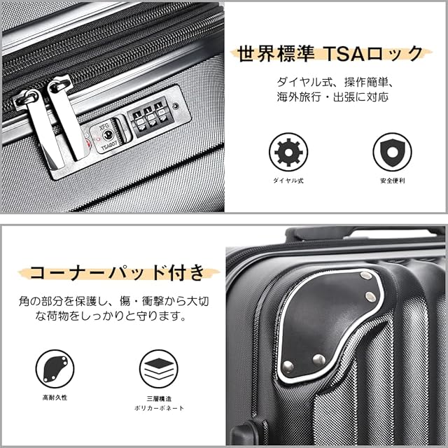 【高品質なボディ&信頼のYKKファスナー】ABS樹脂は軽くて弾力性と割れに強く、PC(ポリカーボネート)樹脂は耐衝撃性・断熱材に優れる、両素材を混合した耐久性が高いハードタイプの高品質ボディを実現しています。また、日本が世界に誇るYKKファスナーをメインファスナーに標準装備。ファスナータイプのスーツケースによくあるファスナーの不具合(ファスナー脱線や開き)を解消し、長期にわたり安定した使用感が可能となりました。