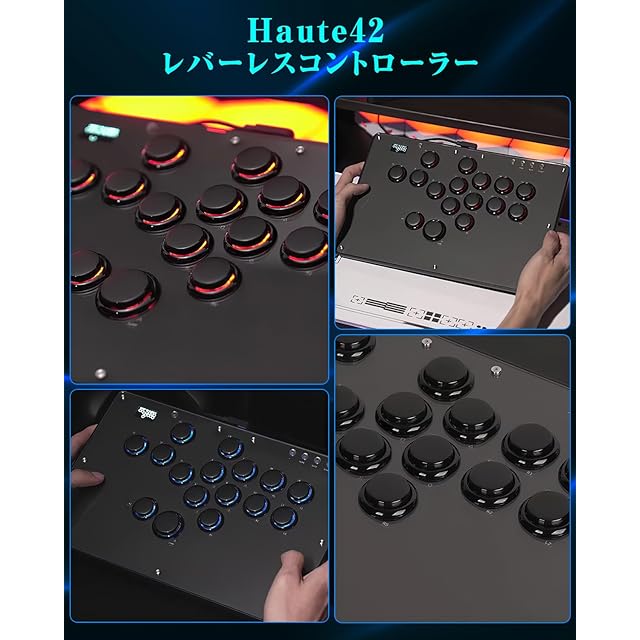【格ゲー向けのレバーレスアケコン Haute42 U16】他社と比べれば、ボタン枠の追加でしっかりして使い手が向上。ボタンが引っかかっていたり、外れたりせず、ちょうどいいサイズで運指がしやすい利点が有ります。本体は薄くて、カバンに入れる時も嵩張らず持ち運びが便利。全体的にボタンの感触や打音がとても良好でありながら、優れた耐久性や機能性も初心者からプロゲーマーまで幅広くお勧めできるレバーレスアケコン。ボタン内部にRGBライトが付いているためボタン自体が七色に光り、ライト発色もカスタマイズ可能です。レバーよりもボタンにより入力スピードが格段に速くなったため、コマンド技が通常よりも早く出て戦闘力が格段に上がったという代物。システムが pico GP2040-CE、不具合修正などのファームウェア更新が可能。対応機種:Windows 10以降/ Steam Deck/PS3/PS4/Switch/Raspberry Pi(Lakka、RetroPie、Recalbox、Batocera)/MiSTer/Android、Linux、iPadOS、macOS. PS5やXBOXに接続する際は、専用の格ゲーコンバーターが必要です。互換性を確保するために、ぜひ別途ご購入ください。弊社では、PS4/PS5に対応したBooter5コンバーターと、XBOX用のBrook Wingman FGCを取り扱っています。