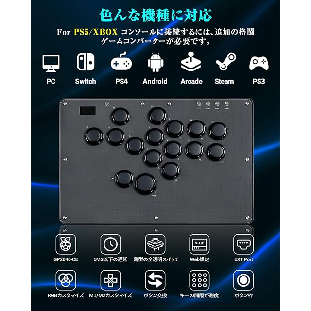 【格ゲー向けのレバーレスアケコンU16黒】 他社と比べれば、ボタン枠の追加で安定感が向上し、操作性が格段に上がった。全体的にボタンの感触や打音がとても良好でありながらボタンが引っかかるや外れることなく、ちょうど良いサイズで運指がスムーズ。さらに、ボタン内部のRGBライトが七色に光り、発色はカスタマイズ可能。レバーよりも入力スピードが向上し、コマンド技を素早く出せるため、戦闘力も格段にアップ!システムが pico GP2040-CE、不具合修正などのファームウェア更新が可能。対応機種:Windows 10以降/ Steam Deck/PS3/PS4/Switch/Raspberry Pi(Lakka、RetroPie、Recalbox、Batocera)/MiSTer/Android、Linux、iPadOS、macOS. PS5やXBOXに接続する際は、専用の格ゲーコンバーターが必要です。互換性を確保するために、ぜひ別途ご購入ください。弊社では、PS4/PS5に対応したBooter5コンバーターと、XBOX用のBrook Wingman FGCを取り扱っています。