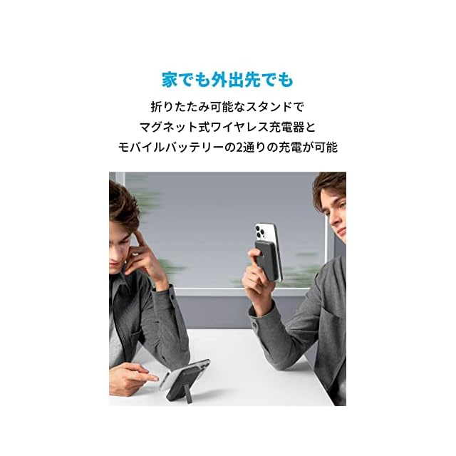 家でも外出先でも:家の中ではスタンドを利用してマグネット式ワイヤレス充電器として、外出先ではスタンドを折りたたみマグネット式ワイヤレス充電対応のモバイルバッテリーとして2通りでの利用が可能。ご自宅でも外出先でもマグネット式ワイヤレス充電を利用可能。