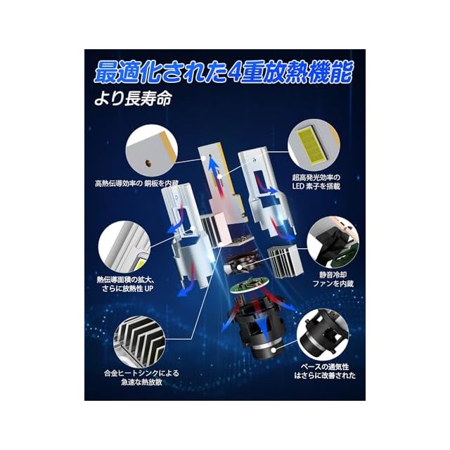 【4重放熱】D4S LED ヘッドライトをSUPAREE特別な放熱システムを搭載、LEDチップは高熱伝導性の銅製板と銅管に搭載されて、LEDチップの高い放熱をアルミボディを伝導して、さらに、ひれ型のヒットシングは放熱面積を従来品より拡大しました、放熱効率は2倍以上になります。ベースの通気性はさらに改善され、最終内蔵な18000RPMのファンで、熱の伝導を速くになりました、従来品ようなLEDチップを劣化したことは解決しました、寿命は50000時間になりました。