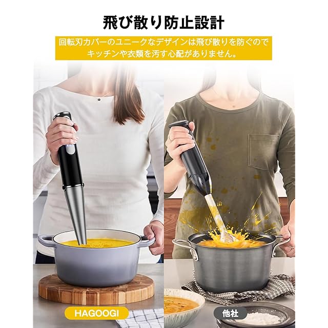 ✨【食品用樹脂素材の保護カバーを採用する!】お客様より「先端が鋭く、鍋の塗装が剥がれる!子供の食事に塗装が混入してしまったと思うとゾッとします!」「鍋底にあたってしまい引っ掻きキズがついてしまいました!」という声があるので、HAGOOGIは従来の鋭い金属製の保護カバーに代わり、高耐熱な食品用樹脂素材の保護カバーを採用します!ブレンダーと容器表面の摩擦を軽減し、容器にキズをつけにくくし、食品汚染のリスクも大幅に低減します。もっと安心に!鍋やボウルで直接使えるから、調理がスムーズに行えます。洗い物も減らせて後片付けがグッと楽に。洗い物を減らしたい方にオススメです!