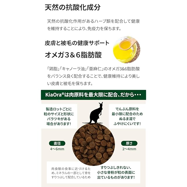 【特徴】<br> オーストラリアの大自然で育った野生の「カンガルー」は、低脂肪、高タンパク、低コレステロールです。<br> Kia Oraが使用するカンガルーは、体にやさしい赤身の健康食肉で、ルーミートと呼ばれ、最近ではベニソンに代わる新規たんぱく源として注目されています。<br> <br> 【野生のジビエ】<br> 限りなく広大な自然が続くオーストラリアは、野生動物が豊かに育つ世界有数の自然大国です。<br> 年間を通じて太陽と雨に恵まれ、自然の草を食べてのびのびと育ったカンガルーは、オーストラリア特有のジビエで高たんぱく低脂肪のヘルシーなお肉です。<br> <br> 【肉原料を最大限に“肉食獣”に適した動物性たんぱく質】<br> 猫は真正肉食動物で、野生の時代からその身体構造(歯・顎)、生理機能(胃・腸)はほとんど変わっていません。<br> 獲物を丸ごと引き裂き飲み込むのに適した鋭い歯と強い顎を持ち、強い酸性の胃はお肉や骨を溶かしてしまう力があります。 <br>KiaOraは、猫の体が自然に求める栄養を十分に摂取できるように、お肉をできるだけ多く配合しました。<br> 消化吸収性に優れたお肉を多く配合することで、消化率を高め糞便の量を軽減します。 <br> また、良質の動物性たんぱくをふんだんに使用し健康を維持することで、たくましい筋肉と骨格を守ります。<br> <br> 【植物性原料を最低限に消化しやすさを追求】<br> 真正肉食動物である猫は、植物性原料の消化吸収は得意ではありません。<br> KiaOraに含まれる植物性原料は、フードの成形に必要な最低限の種類と量に絞って使用されています。<br> <br> 【オーストラリア産、 貴重な新規たんぱく源】<br> 限りなく広大な自然が続くオーストラリアは、野生動物が豊かに育つ世界有数の自然大国です。 <br> 年間を通じて太陽と雨に恵まれ、自然の草を食べてのびのびと育ったカンガルーは、オーストラリア特有のジビエで高たんぱく低脂肪のヘルシーなお肉です。<br> また、非常に厳しい防疫管理及び法規制で守られており、国内の家畜にはBSE(牛海綿状脳症)、口蹄疫、鳥インフルエンザ等の疫病がありません。<br> KiaOraキャットフード「カンガルー」は、100%オーストラリア産の健康なカンガルーのお肉を使用しています。<br> <br> 【低脂肪、高タンパク、低コレステロール】<br> カンガルー肉は、食肉の中で最も低脂肪・低コレステロール・低カロリー。<br> そして野生でたくさん運動して育ったお肉だから、筋肉が発達した良質たんぱくと言えます。<br> <br> 【食物アレルギーに配慮】<br> 穀類を使用せず、動物性たんぱく源を「単一肉原料+フィッシュミール」に絞って、食物アレルギーに配慮しています。<br> <br> 【天然の抗酸化成分】<br> 天然の抗酸化作用があるハーブ類(ローズマリー、グリーンティ、スペアミント)を配合して健康を維持することにより、免疫力を保ちます。<br> <br> 【皮膚と被毛の健康サポート】<br> 「鶏脂」「キャノーラ油」「亜麻仁」のオメガ3&6脂肪酸をバランス良く配合することで、健康維持により美しい皮膚と被毛を保ちます。<br> <br>